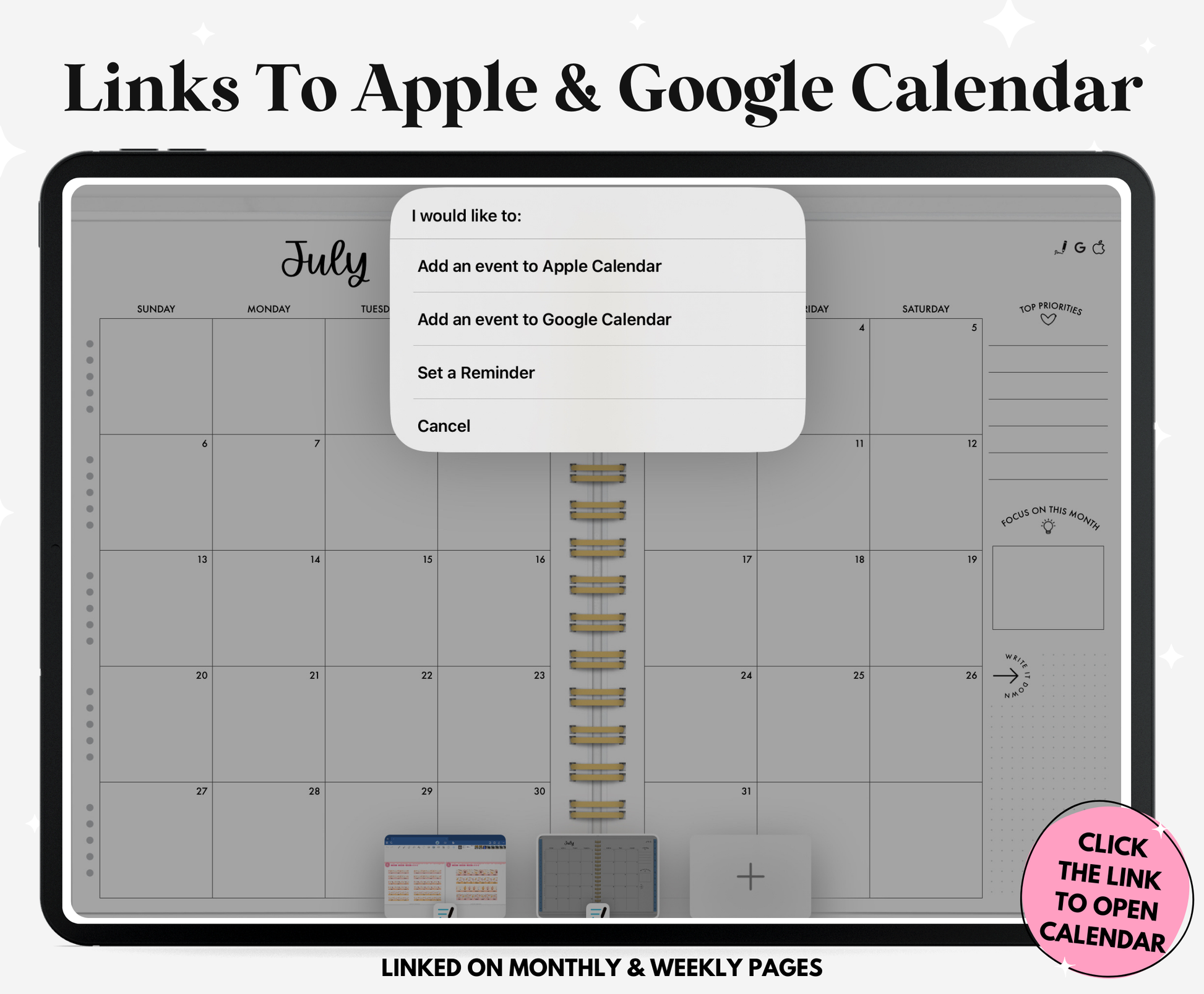 Experience the ultimate convenience with our planner's integrated hyperlinks. Effortlessly create events and reminders in your Google Calendar or Apple Calendar directly from your planner. Say goodbye to manual data entry and hello to seamless digital synchronization.