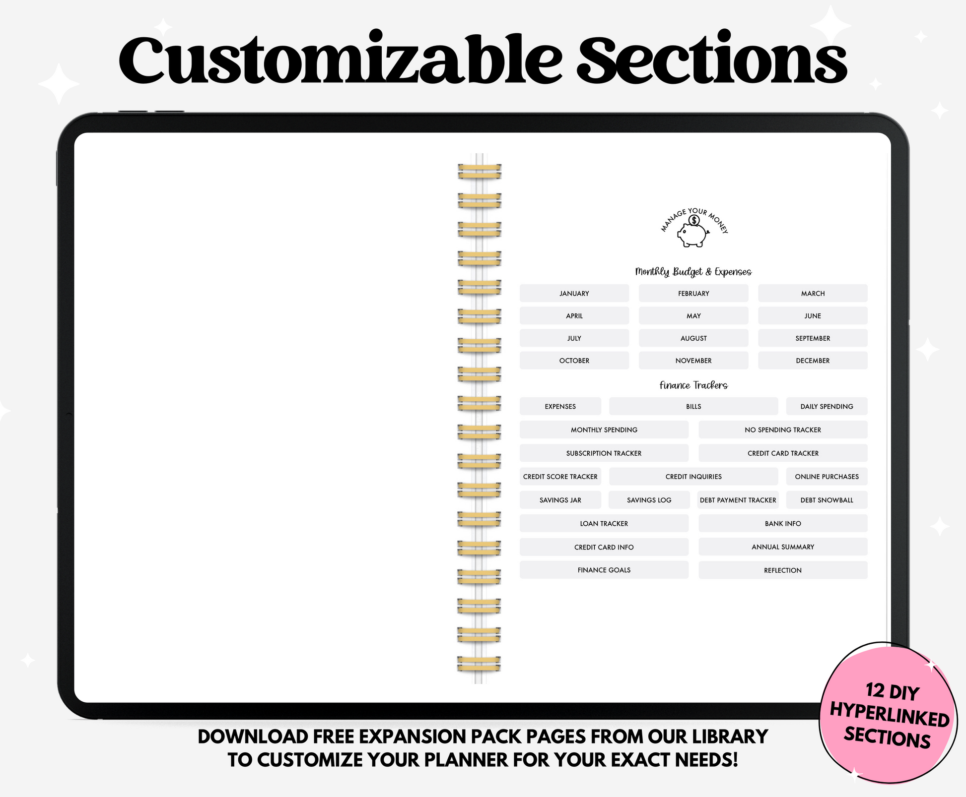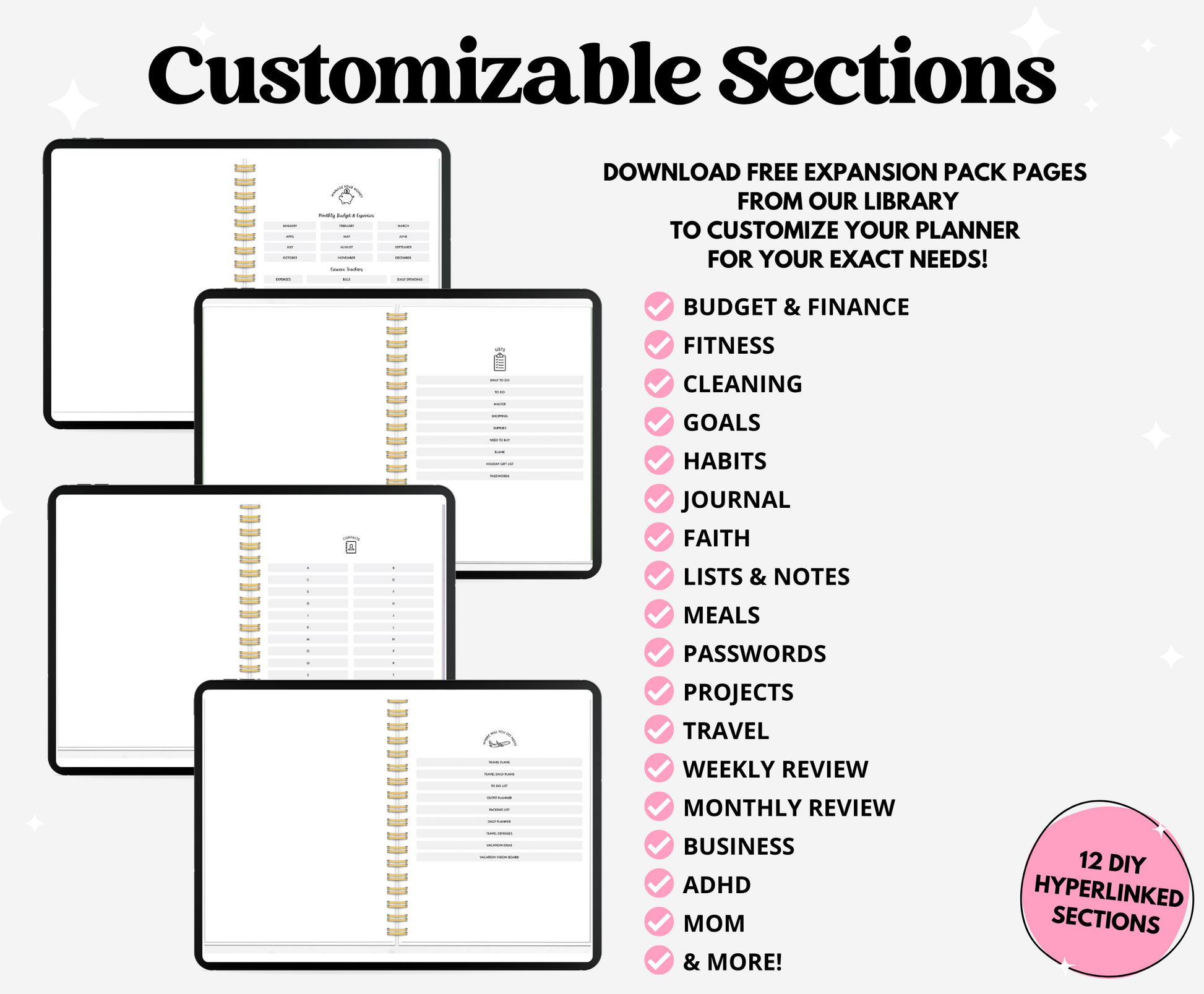 ⭐ Free Expansion Pack planning pages for budgeting, cleaning, meal planning, health & fitness, goals, projects, travel, emergencies, parties & more!