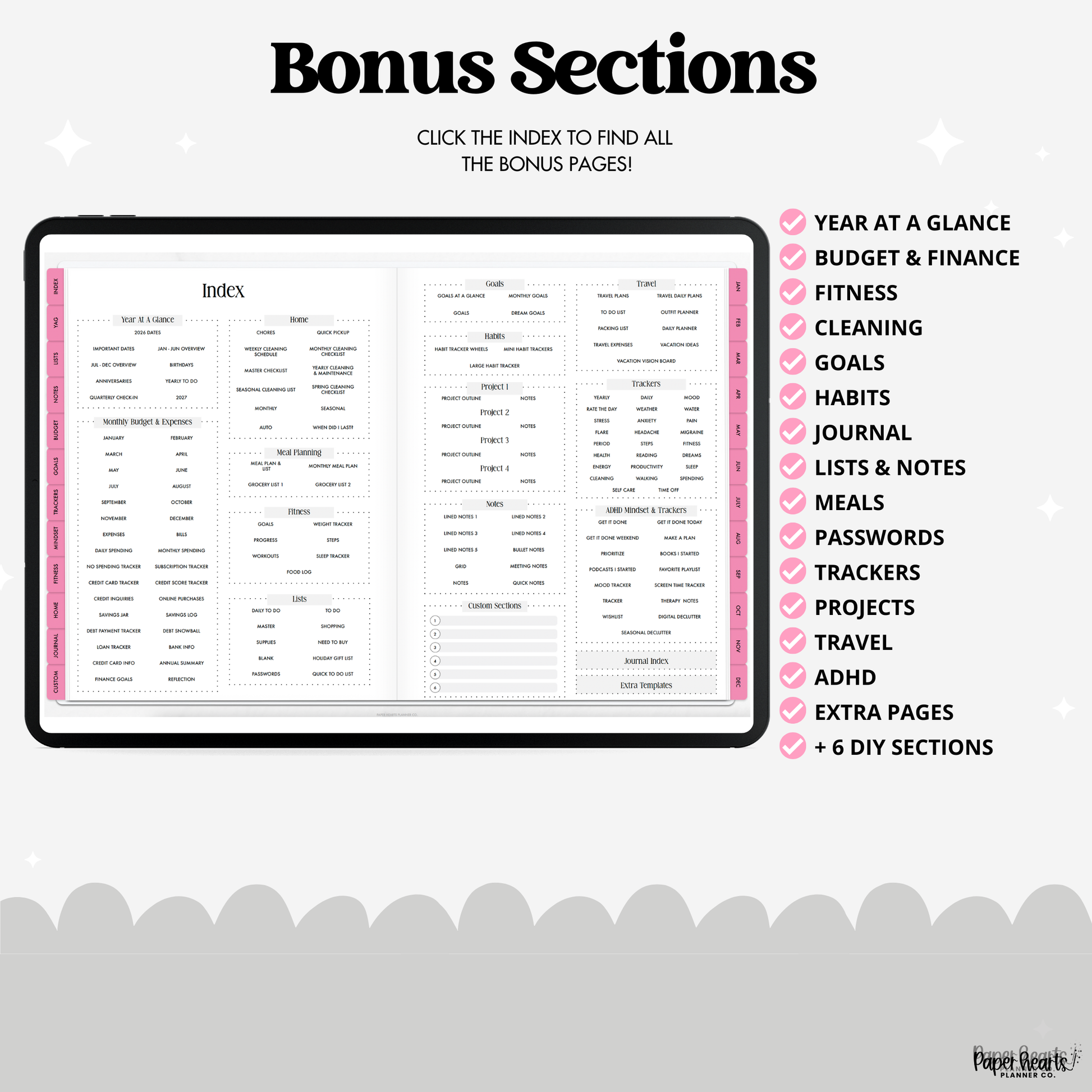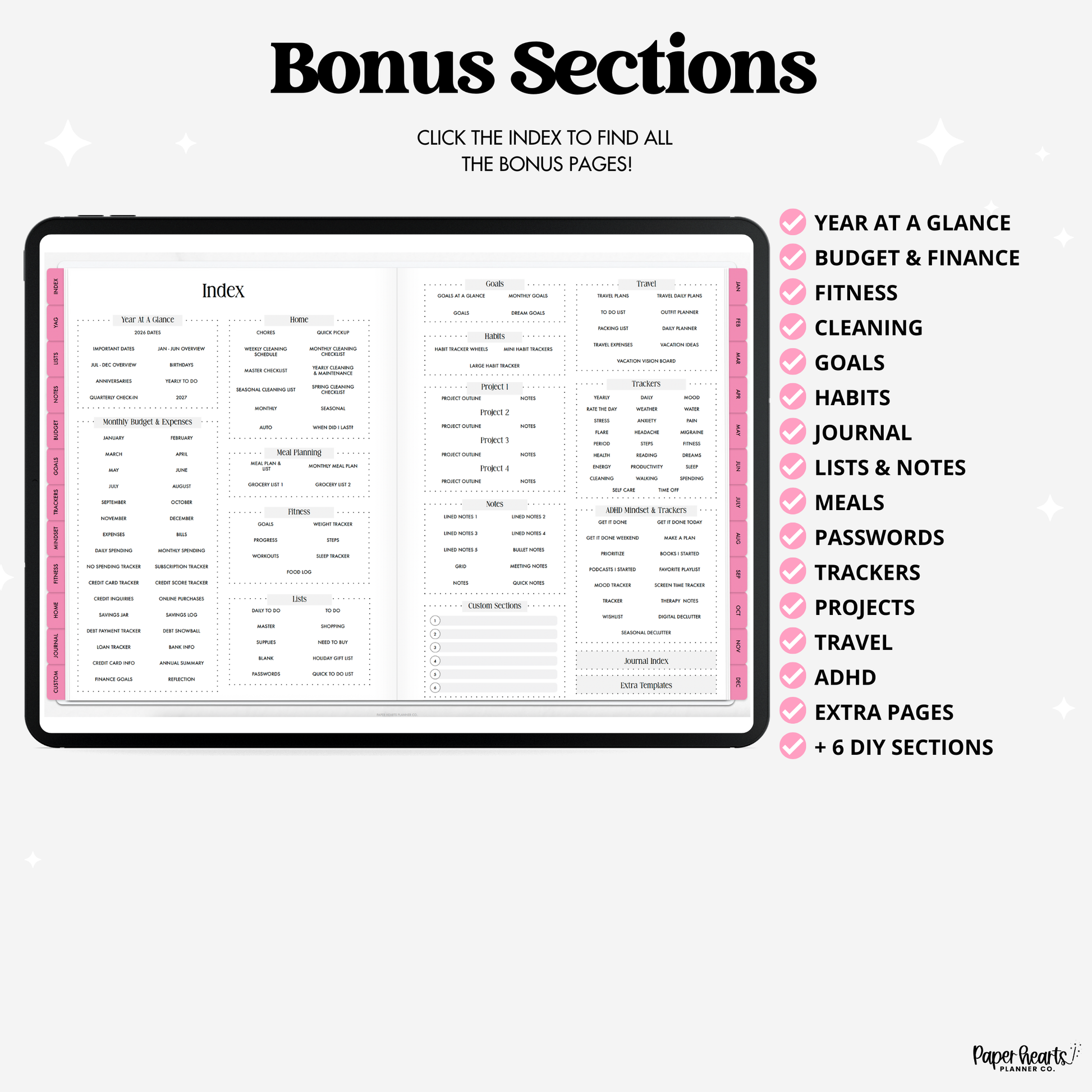 ⭐ Bonus planning pages for budgeting, cleaning, meal planning, health & fitness, goals, projects, travel, ADHD, trackers & more!