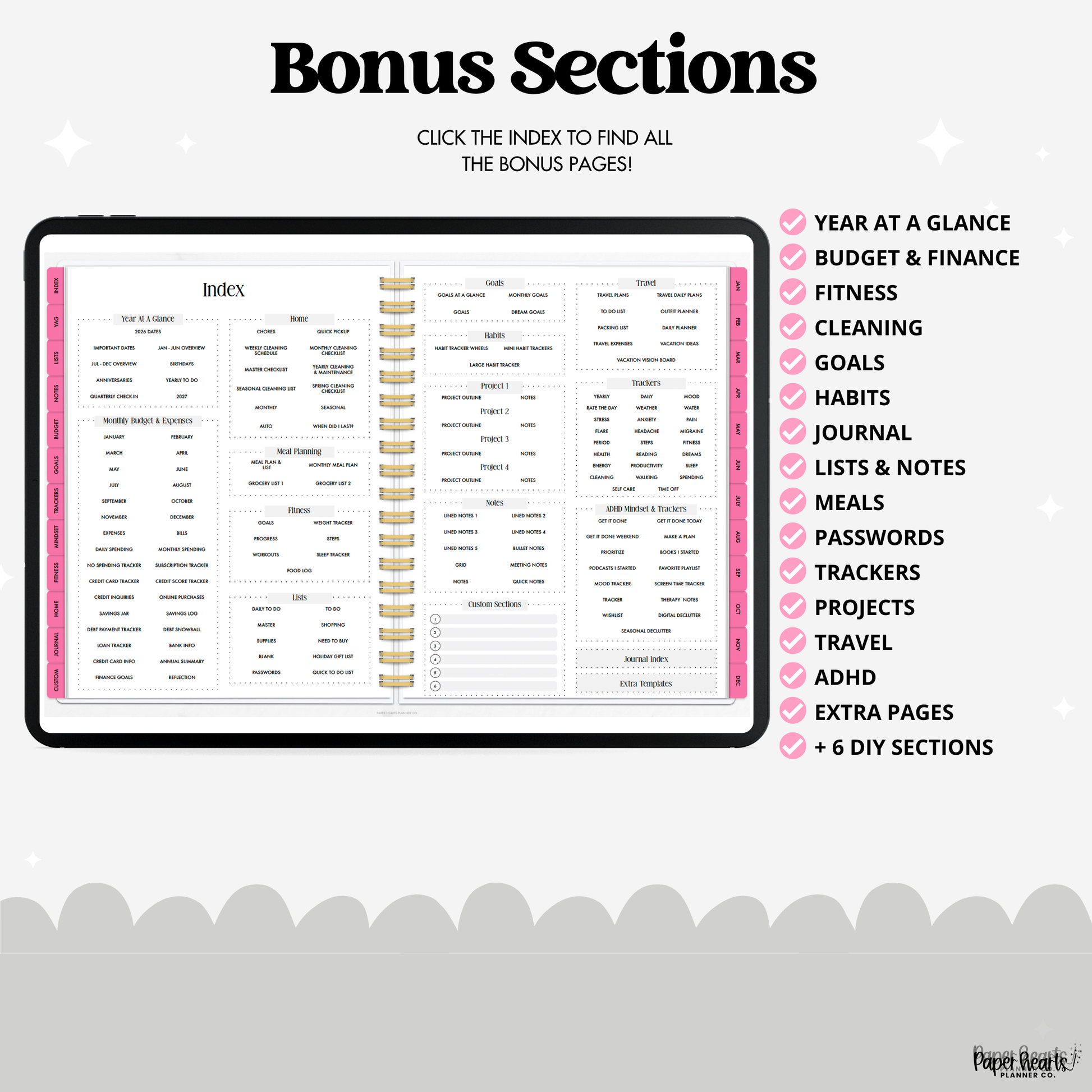 ⭐ Bonus planning pages for budgeting, cleaning, meal planning, health & fitness, goals, projects, travel, ADHD, trackers & more!