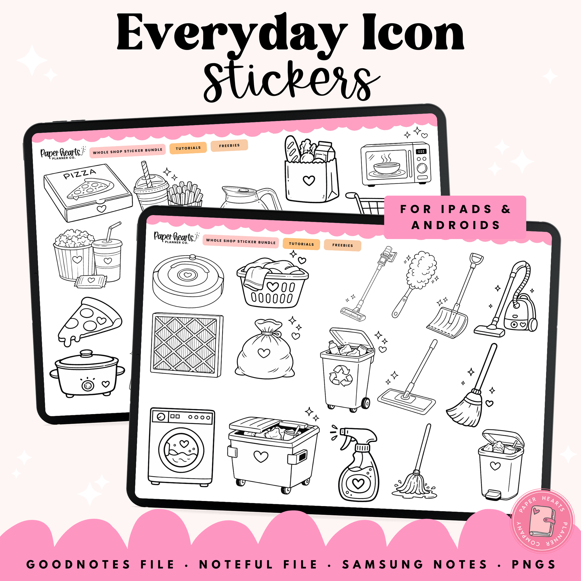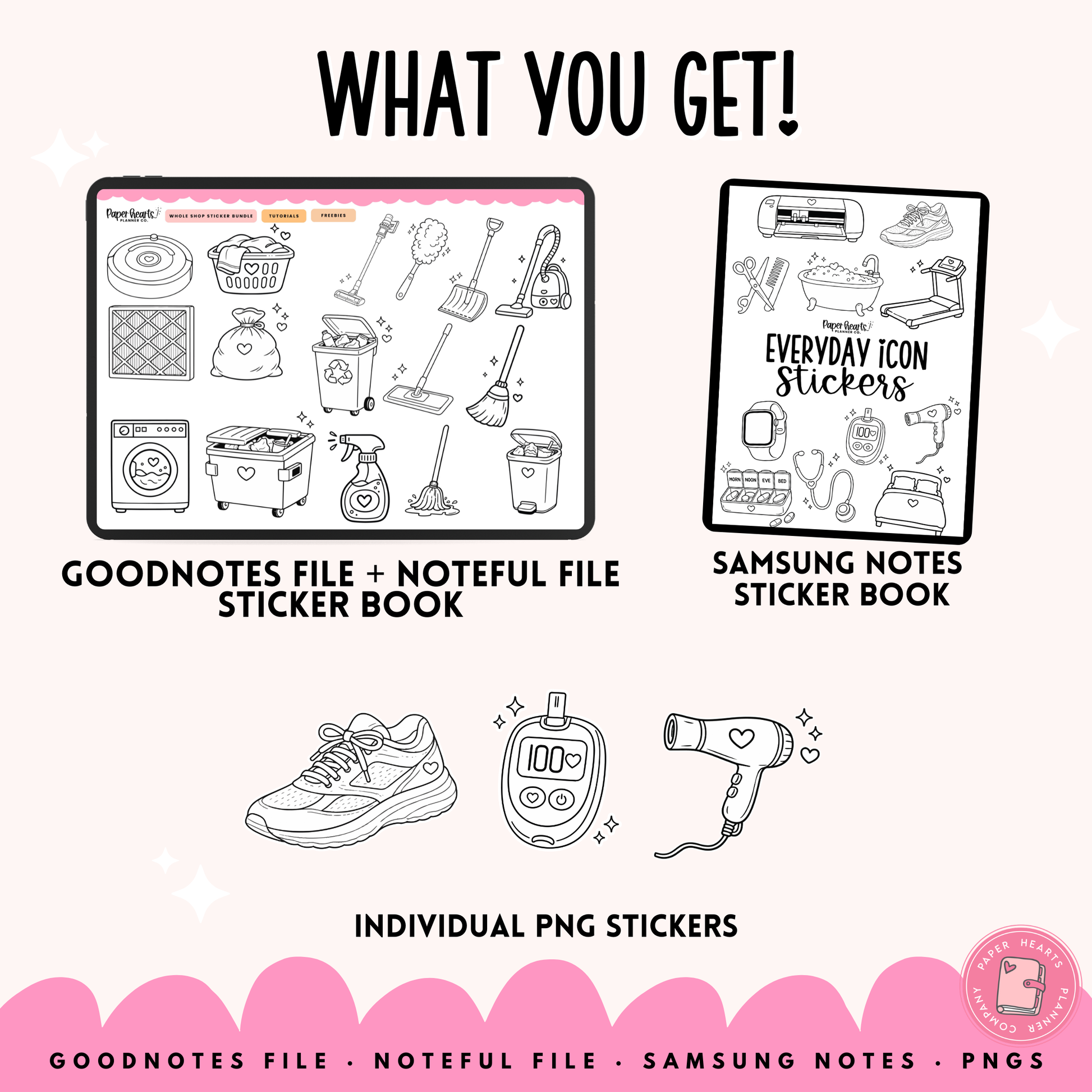 With this digital stickers set you get Goodnotes Stickers, Noteful Stickers, Samsung Notes Stickers and PNG stickers. With these file options you can use these stickers to digital plan on any Apple or Android Device and in most PDF annotation apps!