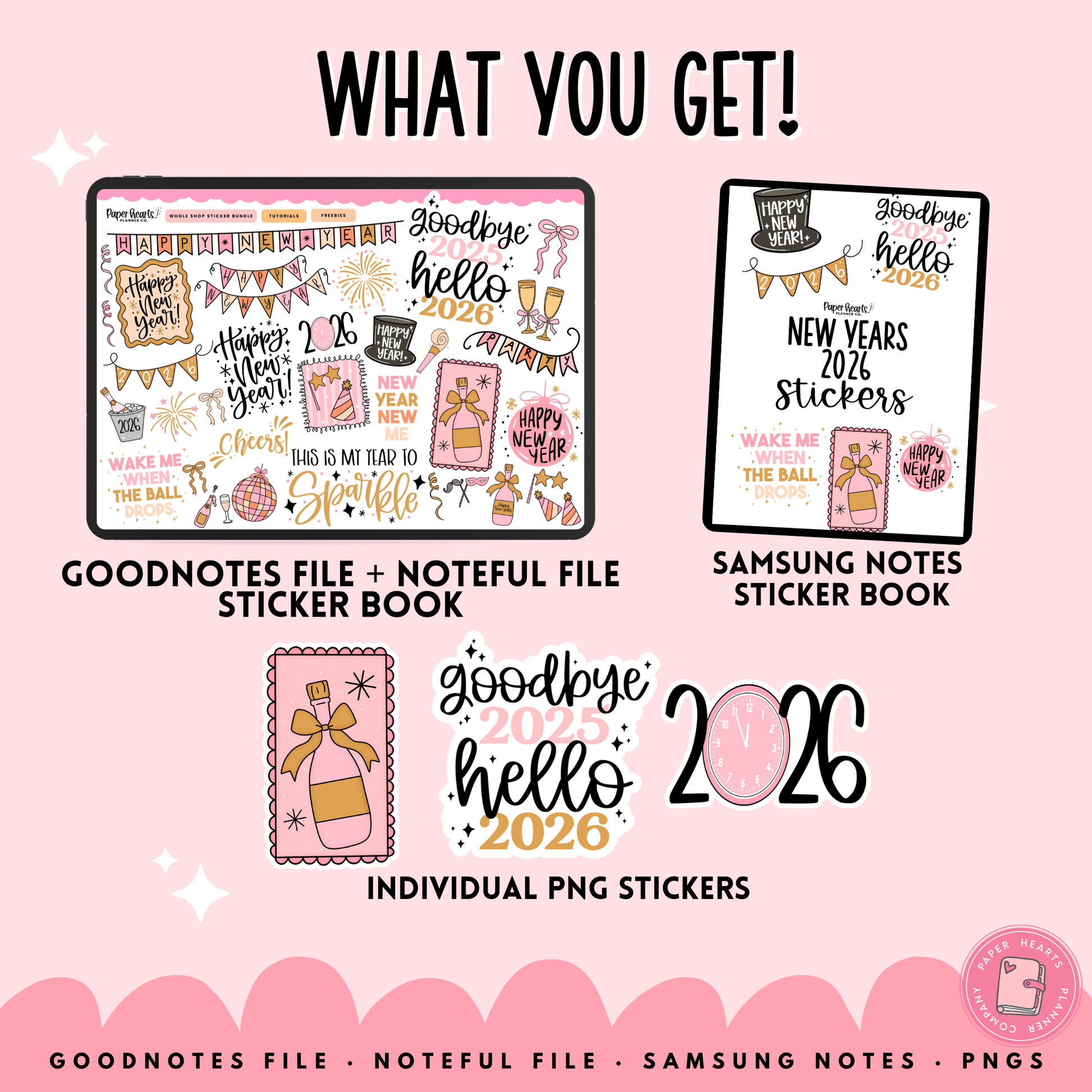 Decorate your digital planner for New Years with these New Years Digital Stickers! These New Years Stickers include so many fun designs to help you ring in 2026! These 2026 Stickers are perfect to decorate your planner with all on New Years Eve & Day!
