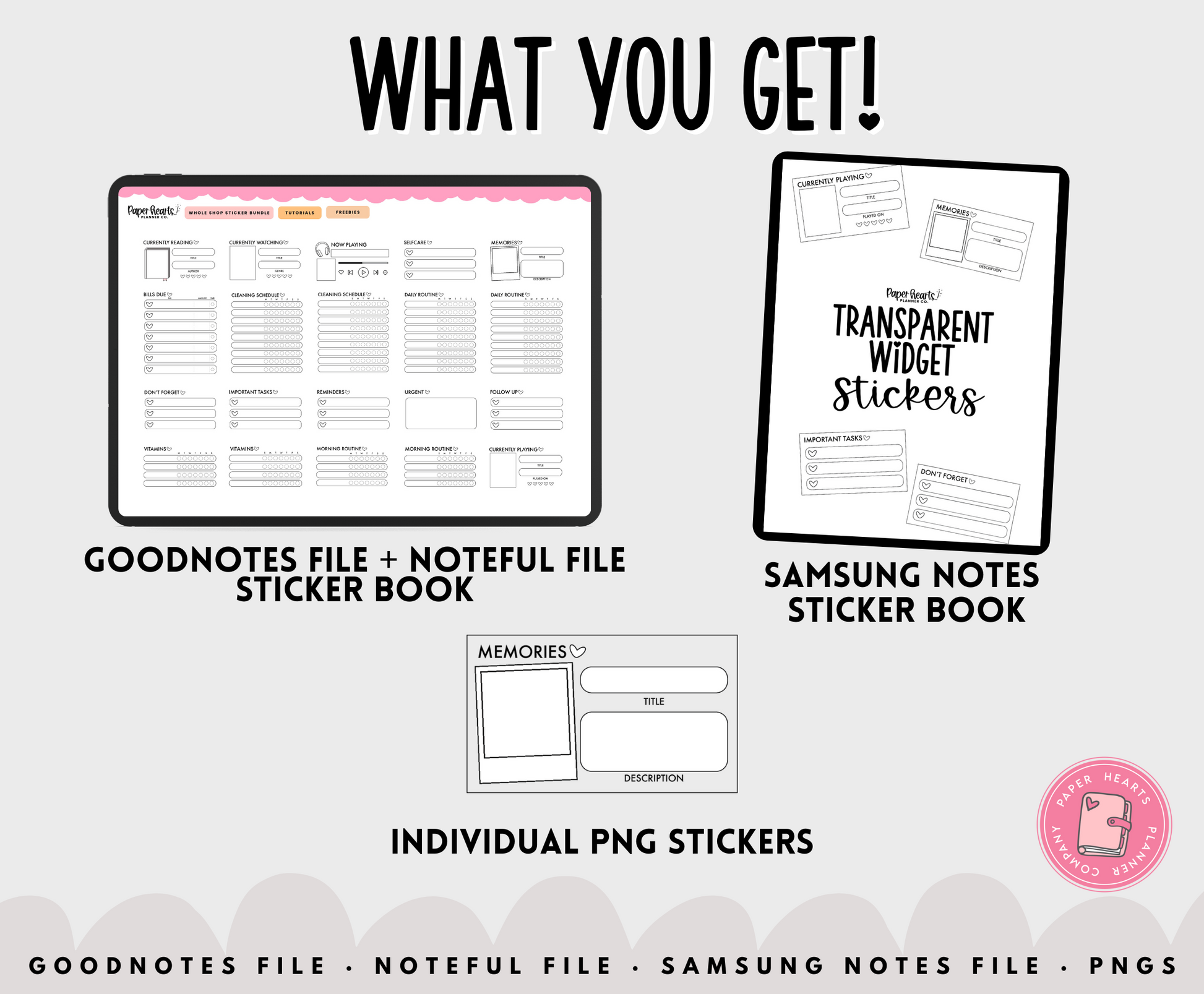With this digital stickers set you get Goodnotes Stickers, Noteful Stickers, Samsung Notes Stickers and PNG stickers. With these file options you can use these stickers to digital plan on any Apple or Android Device and in most PDF annotation apps!